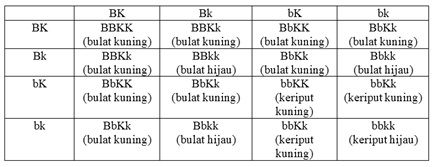 Kacang kapri biji bulat warna kuning (BBKK) disilangkan dengan kacang kuning biji keriput warna hijau (bbkk) menghasilkan F1 kacang kapri biji bulat warna kuning (BbKk). Apabila F1 disilangkan sesamanya, berapa persen F2 yang mempunyai sifat bulat hijau?