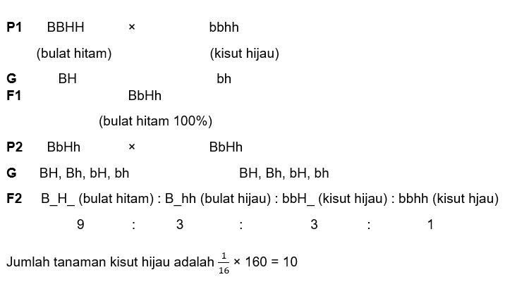 Kacang kapri bulat-hitam (BBHH) disilangkan dengan kacang kapri kisut-hijau (bbhh) menghasilkan keturunan pertama (F1) 100% bulat-hitam (BbHh). Selanjutnya F1 disilangkan sesamanya dan diperoleh 160 tanaman, berapakah jumlah tanaman dengan fenotipe kisut hijau pada F2?