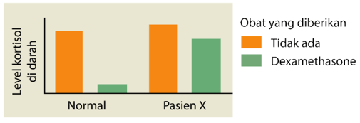 Kadar kortisol (glukokortikoid) yang tinggi secara abnormal dapat memicu obesitas, kelemahan otot, dan depresi pada penderitanya. Produksi kortisol oleh kelenjar adrenal dirangsang oleh hormon ACTH yang dihasilkan kelenjar pituitari. Pelepasan ACTH oleh pituitari dirangsang oleh hormon ACH yang dihasilkan hipotalamus. Untuk menentukan kelenjar yang memiliki aktivitas abnormal, dokter menggunakan obat dexamethasone, glukokortikoid sintetik yang menghambat pelepasan ACTH. Berdasarkan grafik berikut, kelenjar mana yang mengalami kelainan pada pasien X?