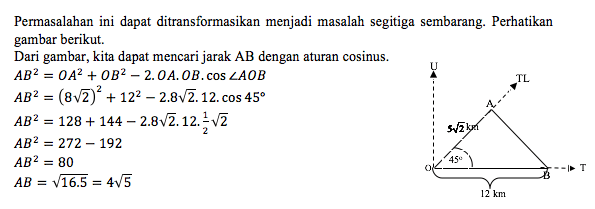 Kapal A bergerak ke arah timur laut sejauh km dan kapal B bergerak ke arah timur sejauh 12 km. Jarak kedua kapal adalah ....