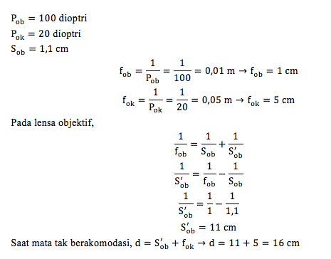 Kekuatan lensa objektif dan okuler mikroskop adalah 100 dioptri dan 20 dioptri. Jika pengamatan dilakukan tanpa akomodasi dan benda diletakkan 1,1 cm dari objektif, maka panjang mikroskop adalah ….