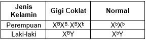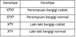 Kelainan gigi coklat pada manusia disebabkan oleh gen dominan yang terpaut kromosom X. Apabila perempuan bergigi coklat yang memiliki Ibu bergigi normal menikah dengan laki-laki bergigi normal kemungkinan keturunannya ....