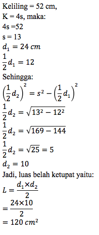 Keliling suatu belah ketupat 52 cm, panjang salah satu diagonalnya 24 cm. Maka luas belah ketupat tersebut adalah…