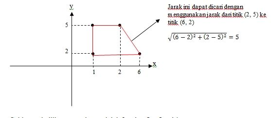Keliling trapesium dengan titik – titik sudut A(1, 2), B(1, 5), C(2, 5) dan D(6,2) adalah… satuan panjang