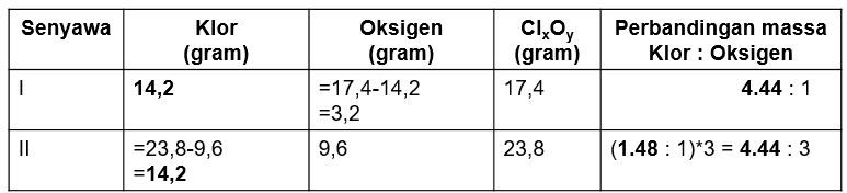 Klorin dan oksigen dapat membentuk dua jenis senyawa. Dalam 17,4 gram senyawa I terdapat 14,2 gram klorin, sedangkan dalam 23,8 gram senyawa II mengandung 9,6 gram oksigen. Perbandingan massa oksigen pada kedua senyawa tersebut adalah .....