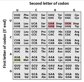 Kombinasi basa nitrogen dalam DNA dapat membentuk 64 kodon berbeda. Akan tetapi hanya 61 kodon yang akan diterjemahkan menjadi asam amino, 3 kodon sisanya membentuk kodon stop. Untuk lebih lengkapnya, perhatikan tabel di bawah ini.