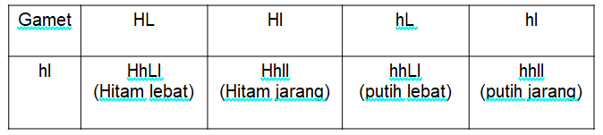 Kucing berbulu hitam lebat (HhLI) dikawinkan dengan kucing berbulu putih jarang (hhll). Hitam dominan terhadap putih, lebat dominan terhadap jarang. Tentukan persentase munculnya anak kucing berbulu putih lebat!