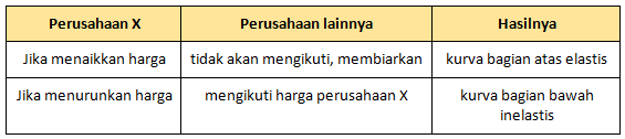 Kinked demand curve bagian atas bersifat inelastis, sedangkan bagian bawah elastis