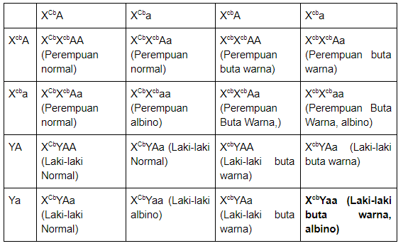 Laki-laki buta warna dan carrier albino akan menikah dengan wanita carrier buta warna dan carrier albino. Berdasarkan pernikahan mereka, persentase peluang kelahiran anak laki-laki dengan buta warna dan albino sebesar ….