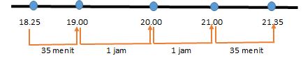 Lama durasi dari pukul 18.25 ke pukul 21.35 adalah ….