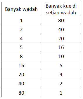 lbu membuat 100 kue mangkuk untuk dibagikan kepada warga yang sedang bekerja bakti. Semua kue mangkuk tersebut ditempatkan pada beberapa wadah sama banyak. Tentukan kemungkinan banyak wadah dan banyak kue mangkuk di setiap wadah!
