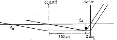 Lintasan berkas sinar ketika melalui sistem optik teropong bintang ditunjukkan seperti pada gambar.