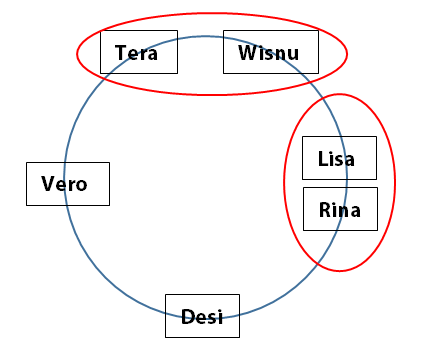 Lisa, Desi, Vero, Tera, Rina, dan Wisnu duduk mengelilingi api unggun. Peluang Tera duduk bersebelahan dengan Wisnu dan Lisa duduk bersebelahan dengan Rina adalah ....