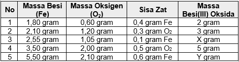 Logam besi direaksikan dengan gas oksigen sehingga menghasilkan besi(III) oksida dengan reaksi :