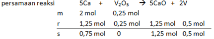Logam vanadium dihasilkan dengan cara mereaksikan vanadium pentaoksida dengan kalsium pada suhu tinggi. Jika 45,5 gram V2O5 bereaksi dengan 80 gram Ca maka jumlah logam vanadium yang dihasilkan adalah .... gram (Ar V: 51, O: 16, Ca:40)