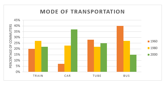 Initially, in 1960, around 20% people used trains, 7% people used cars, 28% people used tubes and around 40% people used buses to go to work or to return from work. After 20 years, the popularity of train and car decreased while the popularity of tube and bus increased.