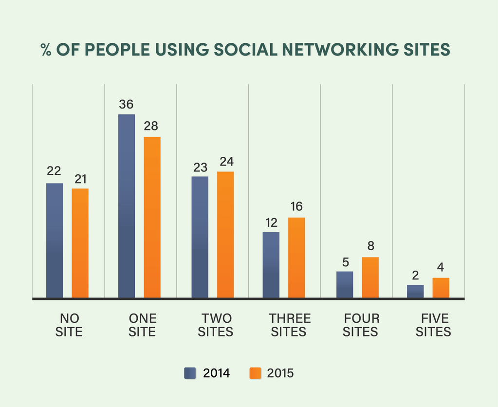 the proportion of internet users fell as the number of social networking sites increased, with only 3 percent using five sites in 2014 compared to 4 percent in 2015.