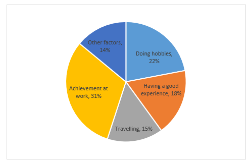 The pie chart shows various the reasons for people under 30 feeling happy. It’s noticeable that the factor of achievement at work takes the least share from the total data.