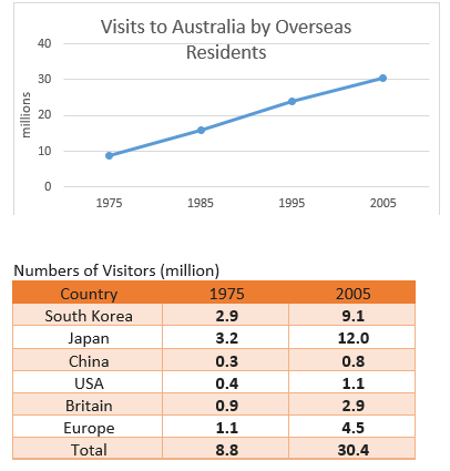 The line graph shows the visit to Australia by non-residents had overwhelmingly moved (a)_____over the period of 2 decades: it was nearly 10 million in 1975 and slightly more than 30 million in 2005. From the data on the table, we can infer that South Korea, Japan and Europe were leading sources of tourists to Australia. Other countries show (b)________. It is worth noticing that (c)_______ in the number of travelers to Australia was from Japan, South Korea and Europe