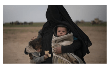 A woman evacuated from the last territory held by ISIL militants carries two children after being screened by the SDF outside Baghouz, Syria on February 26, 2019.
