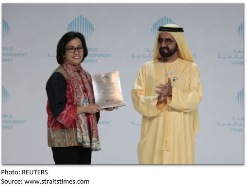Indonesia's Minister of Finance, Sri Mulyani Indrawati, receives the Best Minister Award from Sheikh Mohammed bin Rashid al-Maktoum, Prime Minister and Vice-President of the United Arab Emirates, and ruler of Dubai, on Feb 11, 2018.