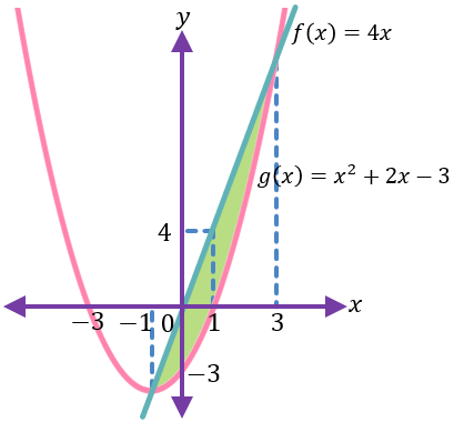 Daerah yang berwarna hijau merupakan daerah yang berada di antara grafik fungsi f(x) dan g(x) yang akan dicari luasnya.