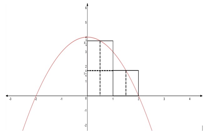 Luas daerah yang dibatasi kurva , sumbu-x, dan menggunakan 2 persegi panjang adalah....