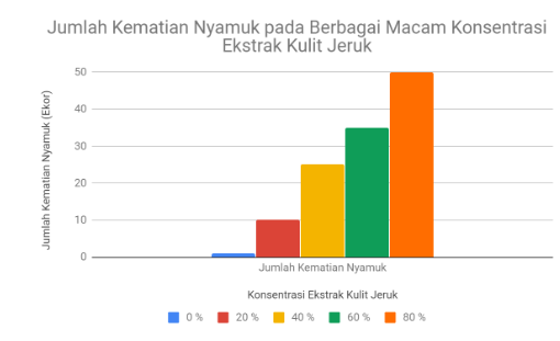 Mahmud bersama teman-temannya melakukan penelitian untuk mengetahui pengaruh pemberian ekstrak kulit jeruk pada berbagai konsentrasi terhadap jumlah kematian nyamuk Aedes aegypti. Hasil penelitiannya disajikan pada diagram batang berikut ini!
