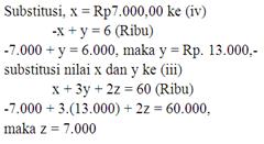 2 straight x plus 2 straight y plus straight z equals 47 space left parenthesis Ribu right parenthesis space bottom enclose 3 straight x plus straight y space plus straight z space equals 41 space left parenthesis Ribu right parenthesis space – end enclose space minus straight x plus space straight y equals 6 space left parenthesis Ribu right parenthesis.......... left parenthesis iv right parenthesis