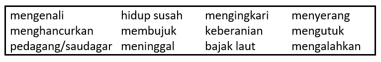 Jadi, jawaban dari soal tersebut adalah "live hard = hidup susah, passed away = meninggal, raided = menyerang, pirates = bajak laut, bravery = keberanian, defeat = mengalahkan, recognized = mengenali, merchant = pedagang/saudagar, denied = mengingkari, pleaded = memohon, cursed = mengutuk, dan wreck = menghancurkan."