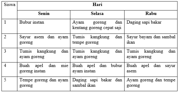 Menu makanan (sayur dan lauk) lima orang siswa selama tiga hari disajikan dalam tabel berikut ini!