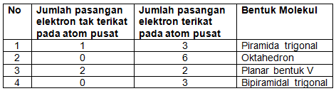 Menurut teori tolakan pasangan elektron, data tentang hubungan jumlah pasangan elektron yang tidak benar adalah....