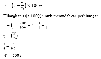Mesin Carnot bekerja pada suhu tinggi 800 K, untuk menghasilkan kerja mekanik. Jika mesin menyerap kalor 800 J dengan suhu rendah 200 K, maka usaha yang dihasilkan sebesar .…