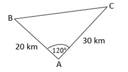 Mobil I dan mobil II berangkat dari kota A secara bersamaan. Dalam waktu yang bersamaan mobil I tiba di kota B yang jaraknya 20 km dari kota A dan mobil II tiba di kota C yang jaraknya 30 km dari kota A. Jika sudut yang terbentuk antara lintasan mobil I dan mobil II adalah 120°, maka jarak kota B dan kota C adalah…