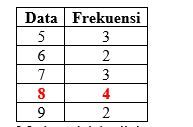 Modus data 5, 6, 7, 8, 9, 6, 7, 8, 8, 9, 5, 7. 8, 5 adalah...