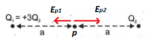 Muatan Q1, Q2 (keduanya positif) terpisah pada jarak 2a seperti gambar berikut.