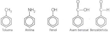 Berikut beberapa senyawa turunan benzena yang mempunyai nama khusus, tergantung gugus yang diikatnya.