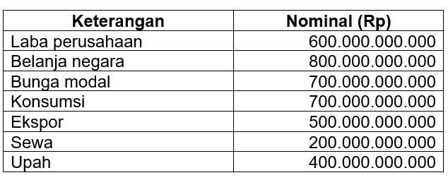 Berdasarkan data di atas, hitunglah pendapatan nasional negara tersebut menggunakan pendekatan pendapatan!