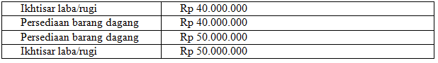 Neraca saldo PD Salak per 31 Desember 2015 mencatat akun persediaan barang dagang Rp40.000.000,00. Data penyesuaian persediaan barang tercatat Rp50.000.000,00. Jurnal penyesuaiannya sebagai berikut.