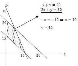 Nilai minimum dari f(x,y) = 3x + 5y yang memenuhi syarat 2x + y ≥ 30, 15 ≤ x + y ≤ 20, x ≥ 0, y ≥ 0 adalah…