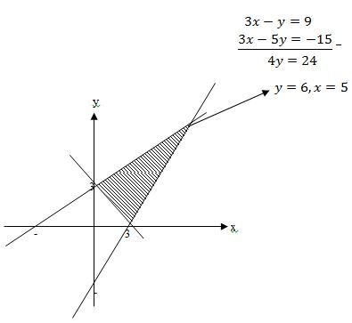 Nilai minimum dari z = 3x + 2y yang memenuhi syarat x + y ≥ 3, 3x - y ≤ 9, 3x - 5y ≤ -15, x ≥ 0 , y ≥ 0 adalah…