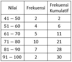Didapatkan informasi bahwa nilai yang berada di urutan ke-13 pada kelas data 71−80 masih kurang dari 72,83, sedangkan pada urutan ke-14 nilainya lebih dari 72,83.