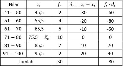 Pertama, akan ditentukan nilai rata-rata dari data di atas dengan metode nilai rata-rata sementara. Misalkan rata-rata sementara data tersebut merupakan nilai tengah kelas 71−80, yaitu 75,5. Nilai tengah (xi), nilai tengah kelas data dikurangi nilai rata-rata sementara (di) dan hasil perkalian fi⋅di dari setiap kelas data dapat ditentukan sebagai berikut.
