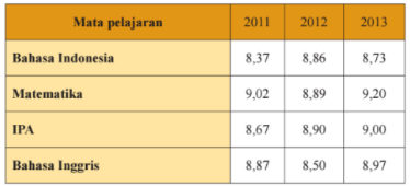 Nilai rata-rata Ujian Nasional dari SMPN 3 Jakarta tahun pelajaran 2011 – 2013 ditunjukkan dalam tabel berikut ini!