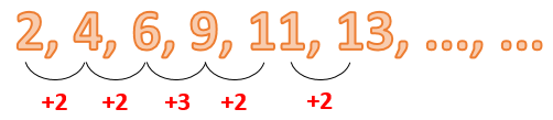 Nilai selanjutnya dari barisan 2, 4, 6, 9, 11, 13,…,…. adalah…