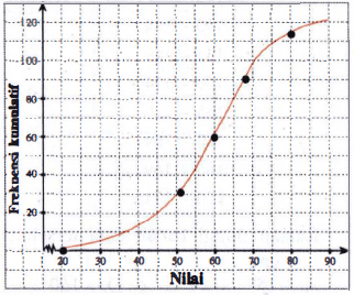 Nilai ujian kimia 120 siswa diperlihatkan seperti kurva ogive berikut.
