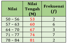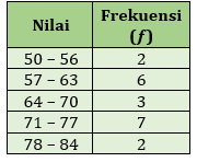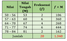 Nilai ulangan matematika 20 siswa SMP Kasih Ibu ditunjukkan oleh tabel berikut ini.