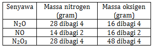 Nitrogen dan oksigen dapat membentuk senyawa-senyawa , NO, dan dengan komposisi massa terlihat dalam tabel berikut.