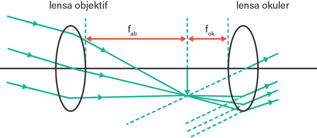 P dan Q adalah dua lensa cembung yang disusun sebagai sebuah teropong untuk melihat suatu benda yang sangat jauh. Gambar berikut menunjukkan lensa yang satu memiliki jarak fokus 5 cm dan lainnya 100 cm.