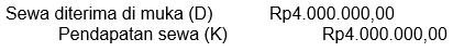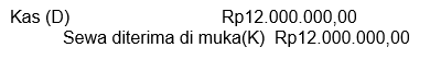 Pada 1 September 2017 diterima di muka sewa Rp12.000.000,00 untuk satu tahun dan dicatat pada jurnal: